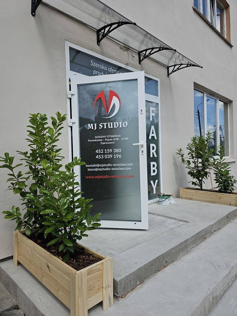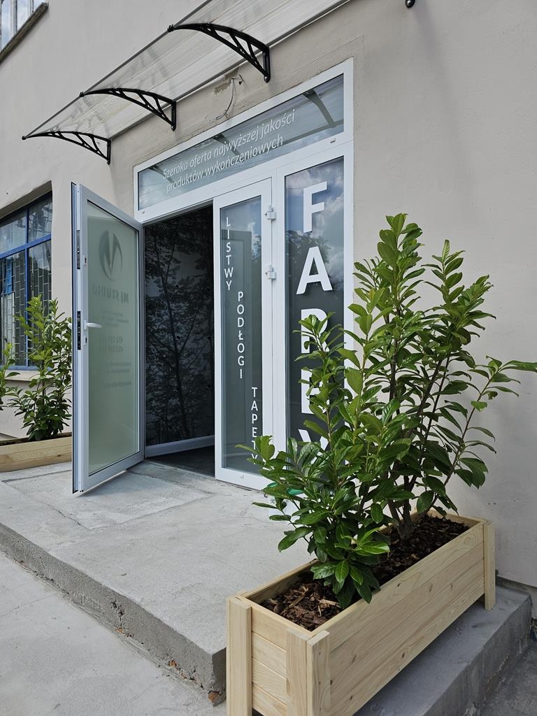 Aranżacja donic przy wejściu do salonu sprzedaży pod Wrocławiem została zaprojektowana jako wizytówka miejsca — pierwsze wrażenie, które subtelnie zaprasza do środka i buduje spójny wizerunek marki jeszcze zanim przekroczy się próg budynku.
